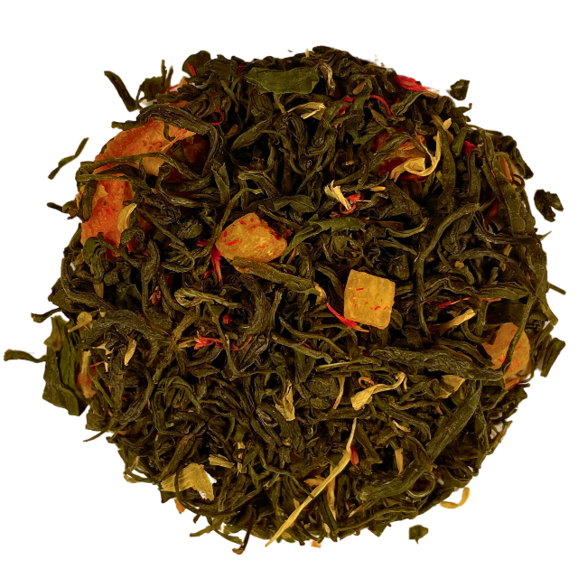 Organic green tea, pineapple cubes (pineapple, sugar), mango cubes (mango, sugar), pineapple and mango flakes, orange slices, natural flavoring, freeze-dried tangerine and orange pieces, freeze-dried strawberry slices, safflower, marigold blossoms.