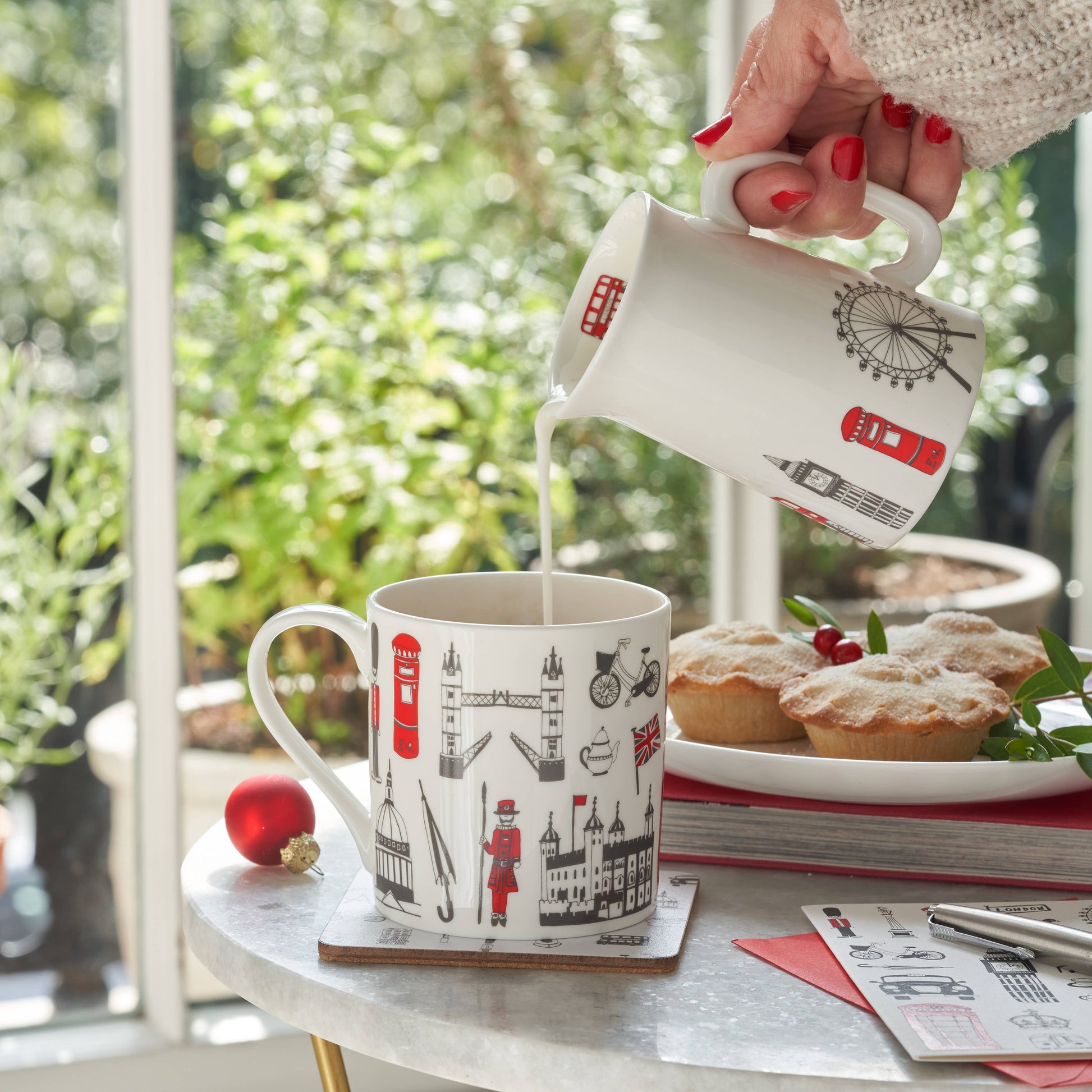 Made entirely in the UK the products are hand-crafted using Cornish clay in Stoke-on-Trent, Staffordshire, the heart of the ‘Potteries’. Using traditional craftsmanship, up to 20 pairs of hands can be involved in making each product. Dimensions: 8.4 x 8.9 cm. Washing: Dishwasher and Microwave safe. -Screen printed and hand-decorated. The beautiful hand illustrated Simply London Collection highlights a nostalgic, whimsical view of London landmarks and serves as a reminder of everything you love about London Keywords: Britain, British, England, English, Capital, Royal, U.K, London eye, Buckingham Palace, The Shard, London Bus, London Bridge, London