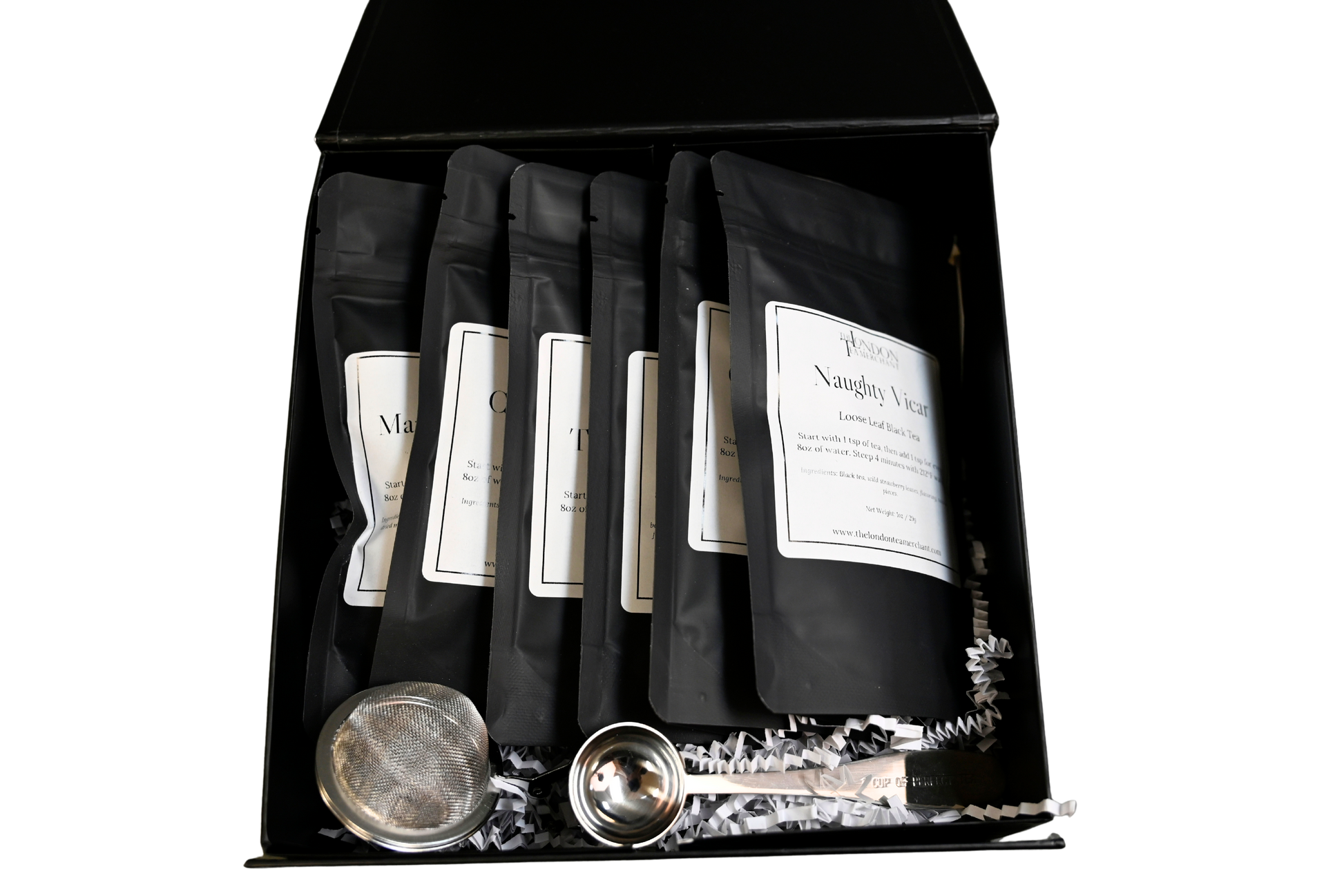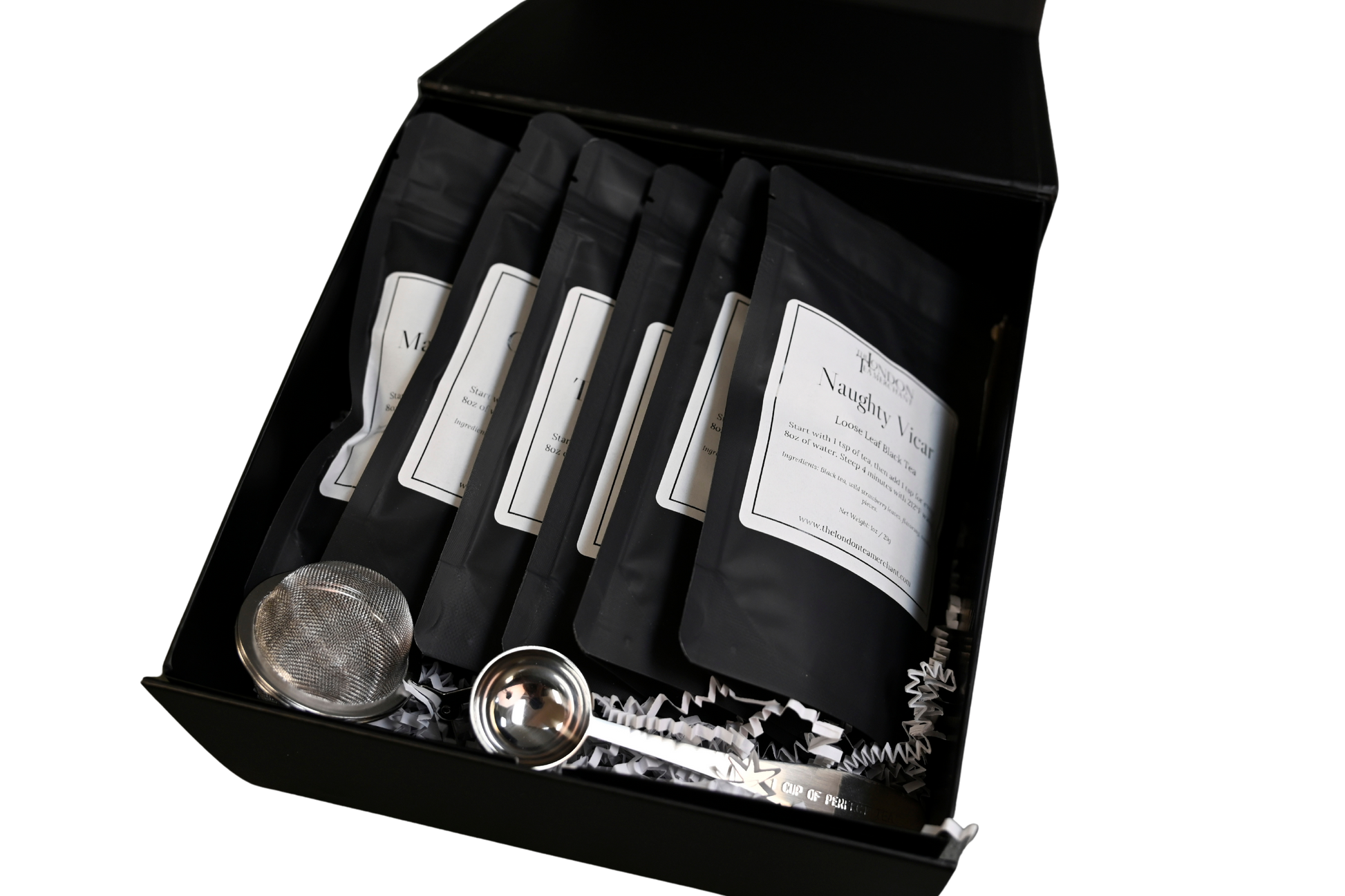 Discover the ultimate tea experience with the LTM Bestseller Deluxe Collection Gift Box. This elegant set includes 1oz sample bags of six favorite blends—Naughty Vicar, Cream Earl Grey, Parisian Breakfast, Canadian Vicar, The London Tea Room Blend, and Mango Pear White—allowing you to explore a range of exquisite flavors. Complete with a stylish teaspoon and tong infuser, all housed in a sleek black box with a magnetic closure, it’s the perfect gift for any tea enthusiast or a treat for yourself.