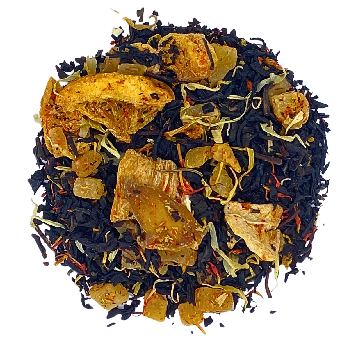 Black tea, pineapple cubes (pineapple, sugar), mango cubes (mango, sugar), pineapple flakes, mango flakes, flavoring, orange slices, freeze-dried tangerine-orange pieces, safflower, freeze-dried strawberry slices, vanilla pieces, marigold blossoms.