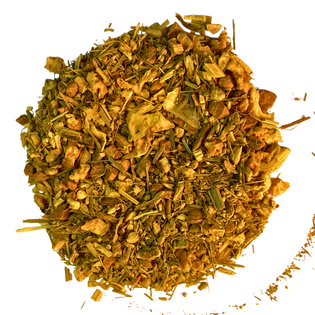 Organic ginger root, organic turmeric root, organic licorice root, organic lemongrass, organic orange peel, organic lemon peel, essential orange and lemon oils.